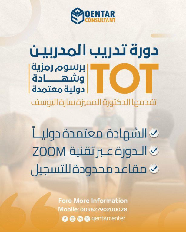سجّل في دورة تدريب المدربين (TOT) التي تقدمها مؤسسة القنطار للاستشارات والتدريب بالتعاون مع مؤسسة تنمية العقل للاستشارات والتدريب (شركة غير ربحية)